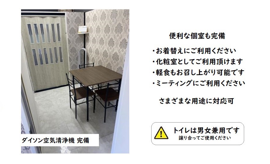 個室・トイレ 完備しておりますので、ご自由にお使いください。