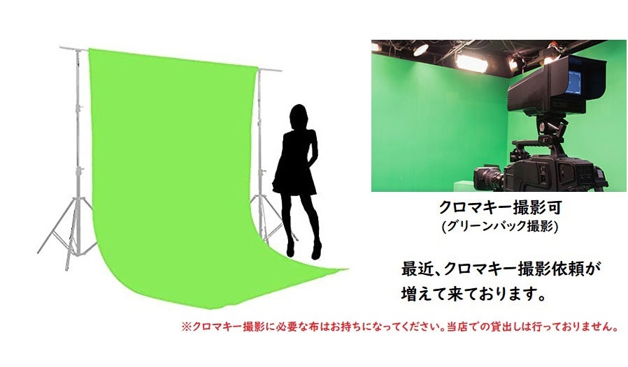 クロマキー撮影の実績が多数あり。ご不明な点が御座いましたらお気軽にお申し付けください。