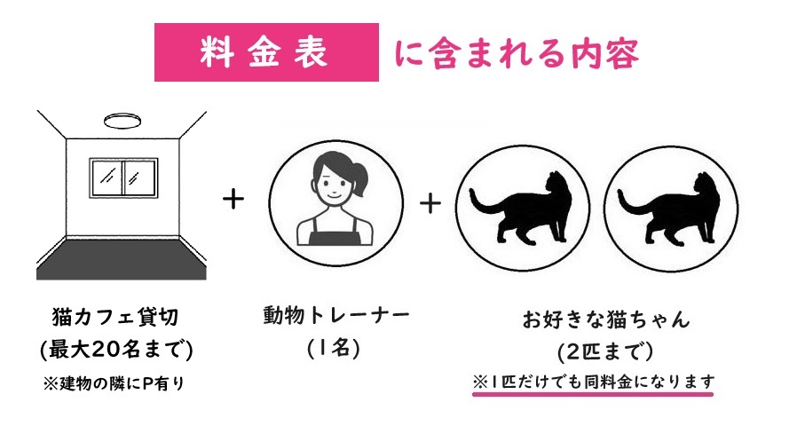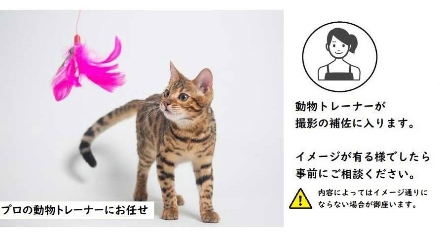 上記価格には、猫カフェ店内貸切+モデル猫×2匹+動物トレーナー×1名が含まれております。