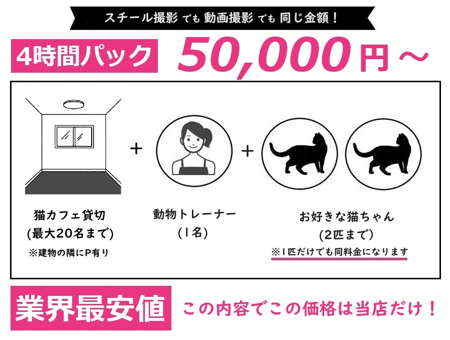 ※上記4時間パックとは、猫カフェ店内貸切4時間+モデル猫×2匹+動物トレーナー×1名が含まれております。